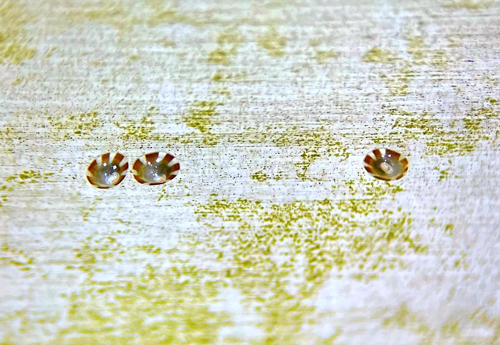 Description : Trois juvéniles de patelles géantes Patella Ferruginea âgés de 60 jours et élevés dans les bassins de la plateforme STELLA MARE Université de Corse/CNRS